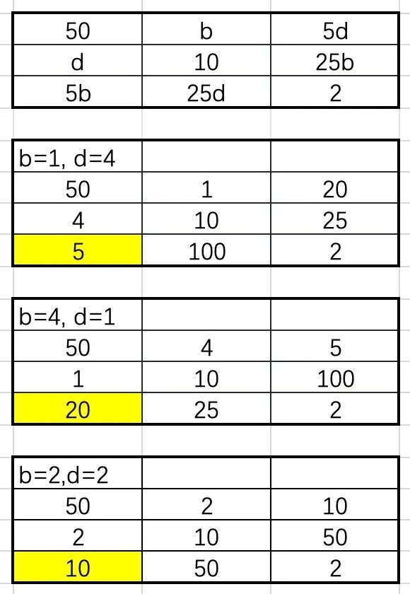 ②/⑤ c/d =50/e; ⑦/① c/d=e/2,得e=10(e∈N)