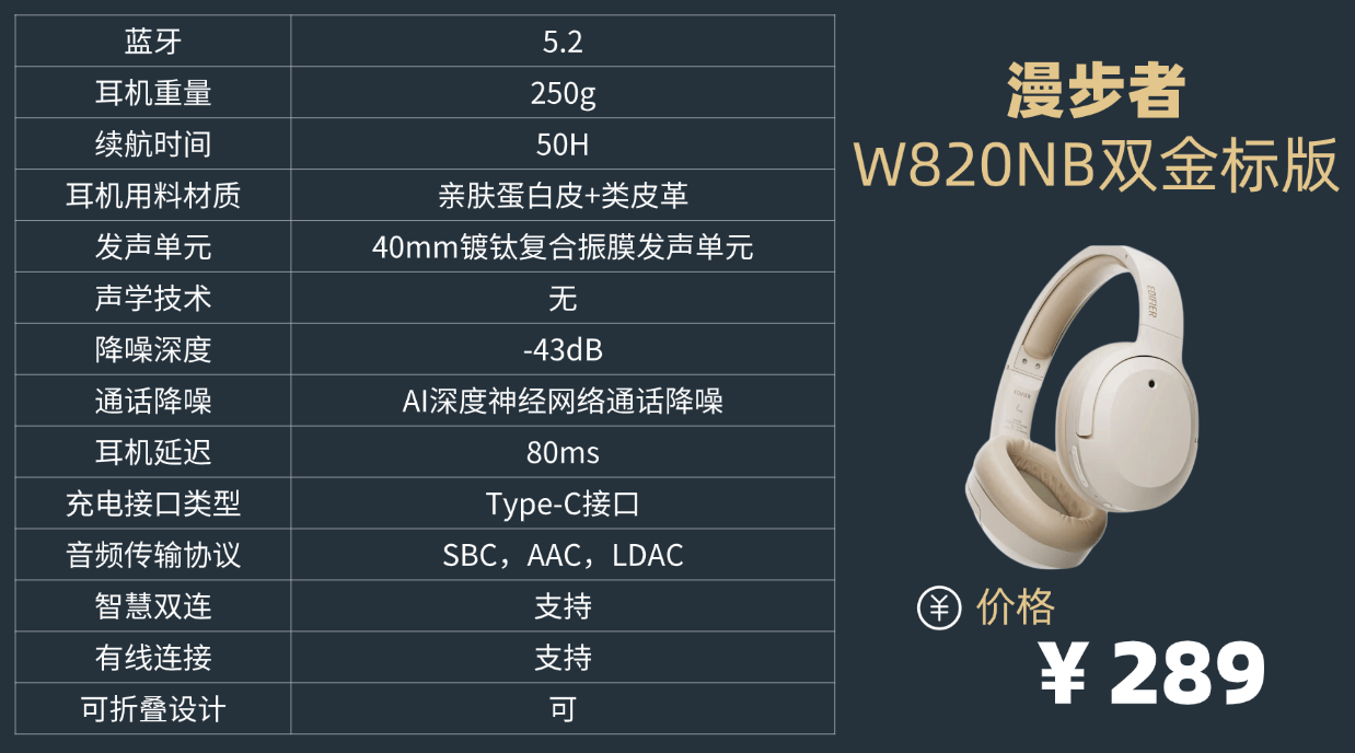 品牌2、漫 步 者W820NB双金标版头戴式降噪耳机