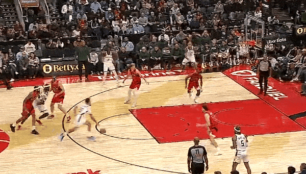 NBA常规赛,雄鹿客场对阵猛龙的比赛正在进行中。比赛的第二节,科尔-安东尼突破分球,库兹马底线空切完成空接上篮。