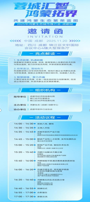 (成都讯) 记者近日从活动组委会获悉,以“蓉城汇智,鸿蒙拓界”为主题的鸿蒙生态企业合作推介会,将于11月20日在四川省成都市锦江区文轩国际会议中心隆重举行。本次推介会旨在深度解析鸿蒙生态的广阔前景与亿元现金激励计划,并权威解读成都市锦江区专项扶持措施,为西南地区科技企业融入鸿蒙生态、共享万物智联时代红利搭建高效平台。