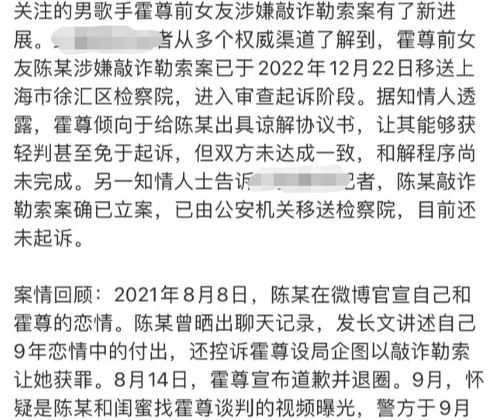 所以在2023年6月9号,媒体报道出来,陈露涉嫌敲诈勒索,霍尊要求其签署谅解协议书,但是未达成一致,警察调查了此事并且曝出了当时疑似是霍尊和前女友陈露谈判的视频,其中还有其闺蜜王萌。