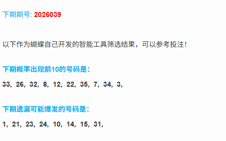 本期分析:本期的冷热分布,本期的遗漏大于9的号码有8个,上期的冷码开出了1个号码,温码开出了4个号码,上期热码开出了0个号码,上期的冷码只开出了1个号码,温码开出了4个号码,热码一个也没有,那么本期的热码只需要考虑1个号码即可,冷码考虑1到2个号码,温码补位2到3个号码。(热码:蝴蝶算法中概率前10的号码,只有10个;冷码:遗漏大于等于9的号码;温码:排除前2类之外的剩下的号码,都是温码;)