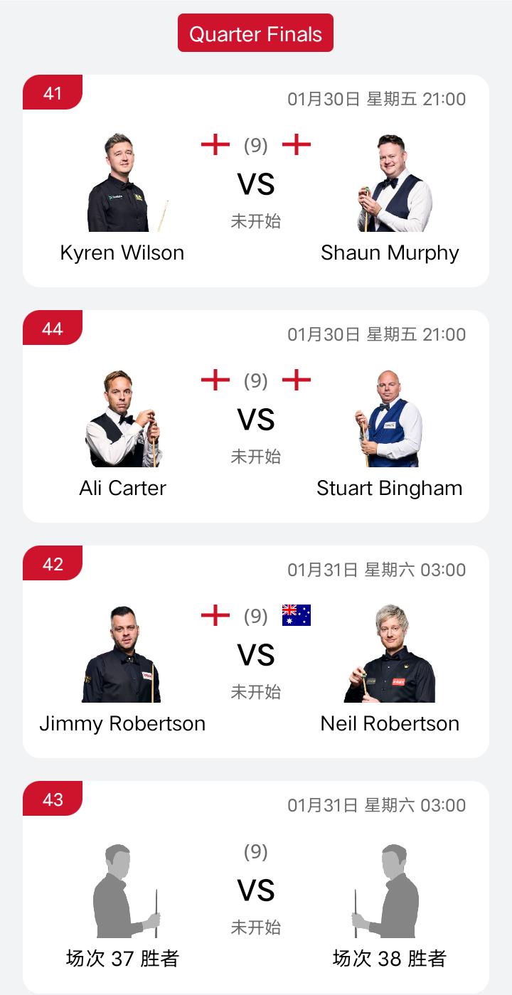 印度一哥,排名赛四强选手查达全场单杆最高分仅18,单局最多29分,大比分0-5出局。大满贯得主罗伯逊连续五局打出单杆50+致胜。