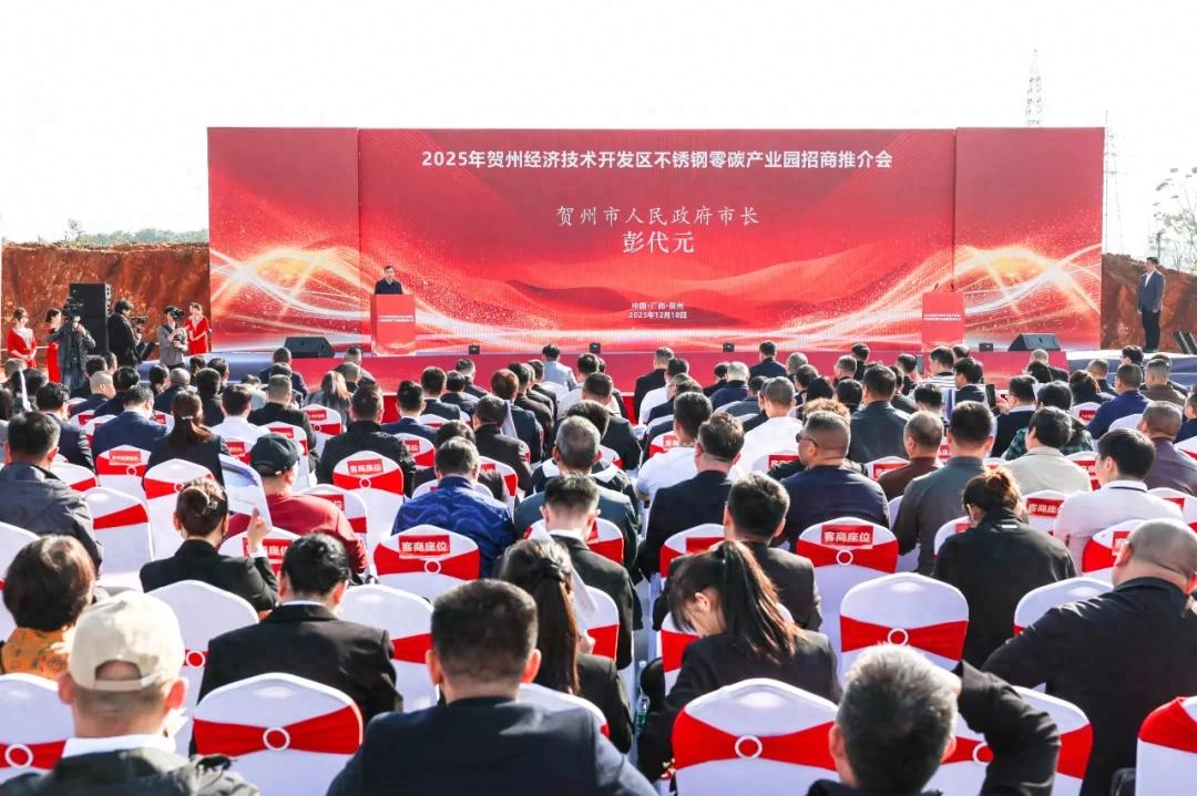 12月18日,2025年贺州经济技术开发区不锈钢零碳产业园招商推介会举行,旨在充分释放园区政策红利、区位优势与产业潜力,搭建政企对接、资源聚合的高效平台,吸引更多优质企业落地扎根,推动不锈钢产业链上下游协同升级。来自全国各地的200余名不锈钢产业领域企业家、100余家行业企业齐聚一堂,共话合作机遇、共谋发展新篇。市长彭代元出席推介会并致辞。