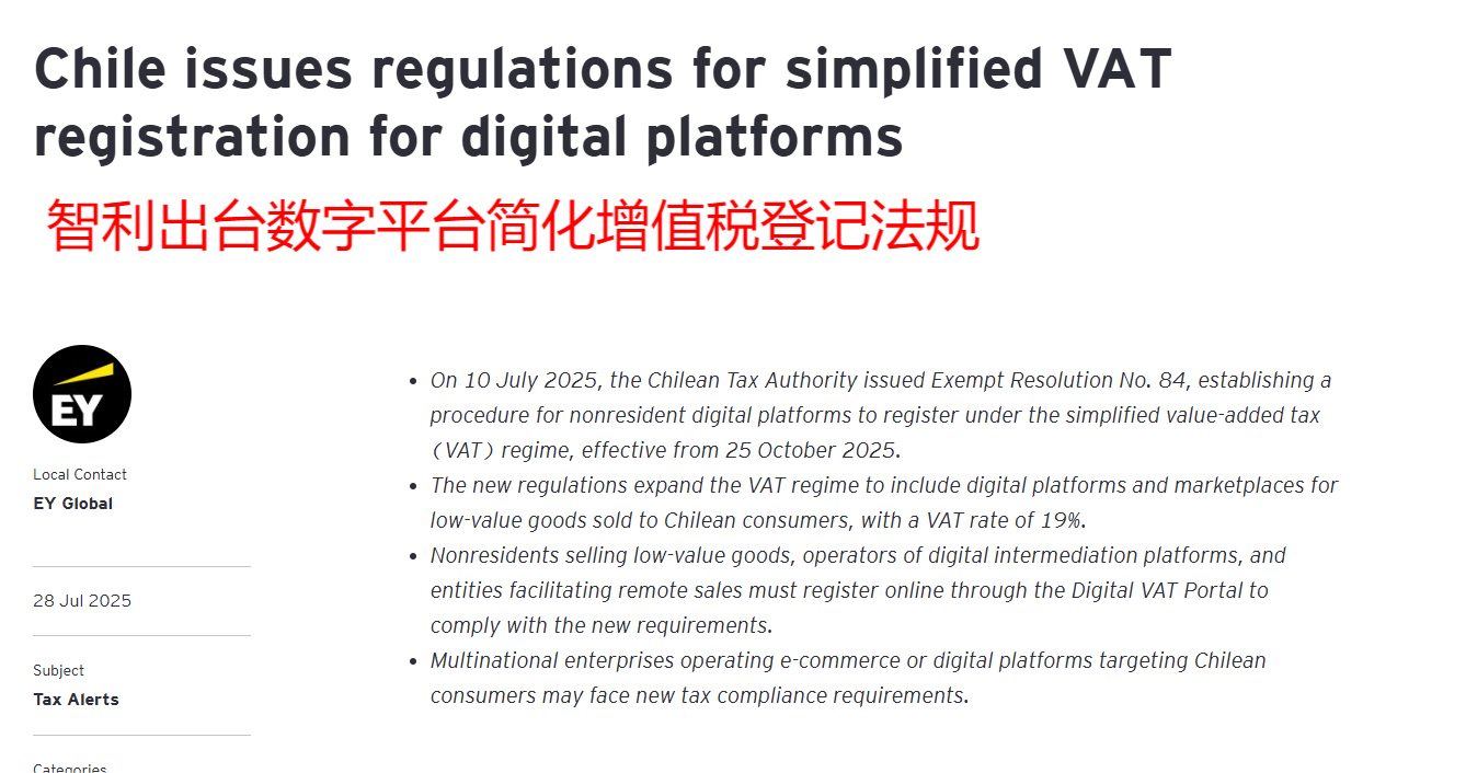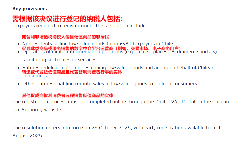 又一税改消息,智利税务当局宣布自10月25日起全面取消小额跨境包裹免税政策,所有价值0-500美元的进口商品均需缴纳19%的增值税。