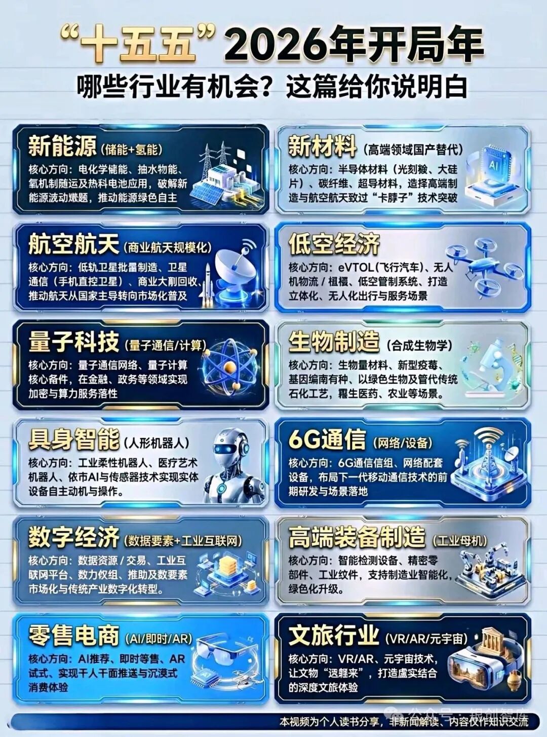 十五五10大重点产业,锚定现代化产业体系建设核心,划分梯次发展格局:以新能源、新材料等成熟产业筑牢发展底盘,以集成电路、生物医药等攻坚产业补齐产业链短板,以量子科技、人机融合智能等未来产业抢占前沿赛道,全方位兼顾稳增长、补短板、谋长远,是未来五年政策倾斜、资本聚焦、人才集聚的核心风口,更是撬动经济高质量发展、实现科技自主突围的关键抓手。