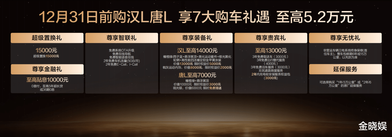 在产品之外,比亚迪特别推出丰厚外观限时选装权益。其中,汉L原价13000元的外观套装(含橄榄绿/西子蓝车色、悬浮黑顶、黑化运动套件、哑光黑化轮辋、性能四活塞定钳金甲黄涂装),限时权益价仅需5000元!唐L价值10000元的橄榄绿/悬浮黑顶,限时权益价3000元;价值6000元的琉光银车色,限时免费赠送。现在订购汉L或唐L,即可享受高达15000元的超级置换礼。(以上权益截至12月31日)