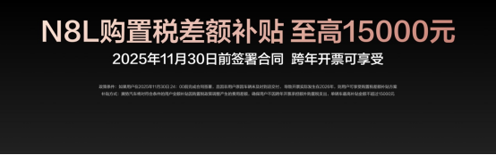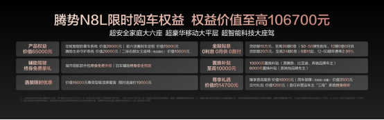腾势N8L全系标配“六大核心科技”,包括易三方整车智能控制技术、云辇-A智能空气车身控制系统等,在豪华感、安全感与科技感方面实现全面超越。为回应用户期待,腾势同步推出限时购车权益,权益价值至高10.67万元,涵盖金融免息、置换补贴及购置税保障等多重礼遇。