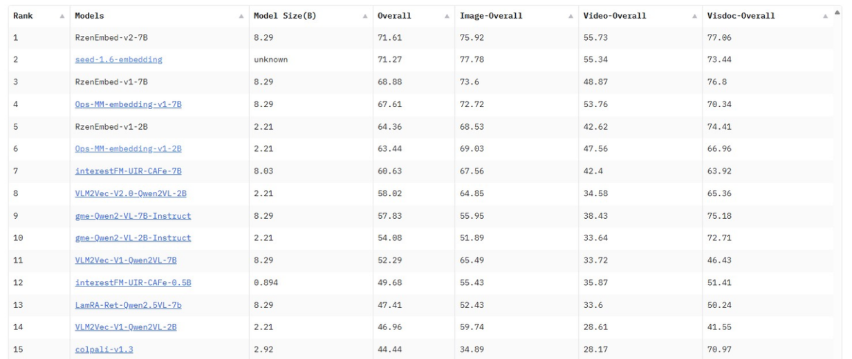 多模态Embedding模型RzenEmbed支持图+文+视频的任意混合模态向量化,在国际MMEB多模态向量化榜单上超过豆包seed1.6-MoE,一举拿下总榜排名和多模态文档赛道排名双Top1。