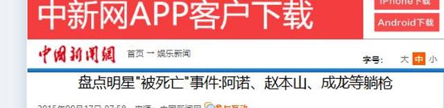 中国新闻网(盘点明星"被死亡"事件:阿诺、赵本山、成龙等躺枪 2015.09.17)