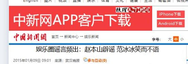 中国新闻网(娱乐圈谣言频出:赵本山辟谣 范冰冰笑而不语 2015.01.09)