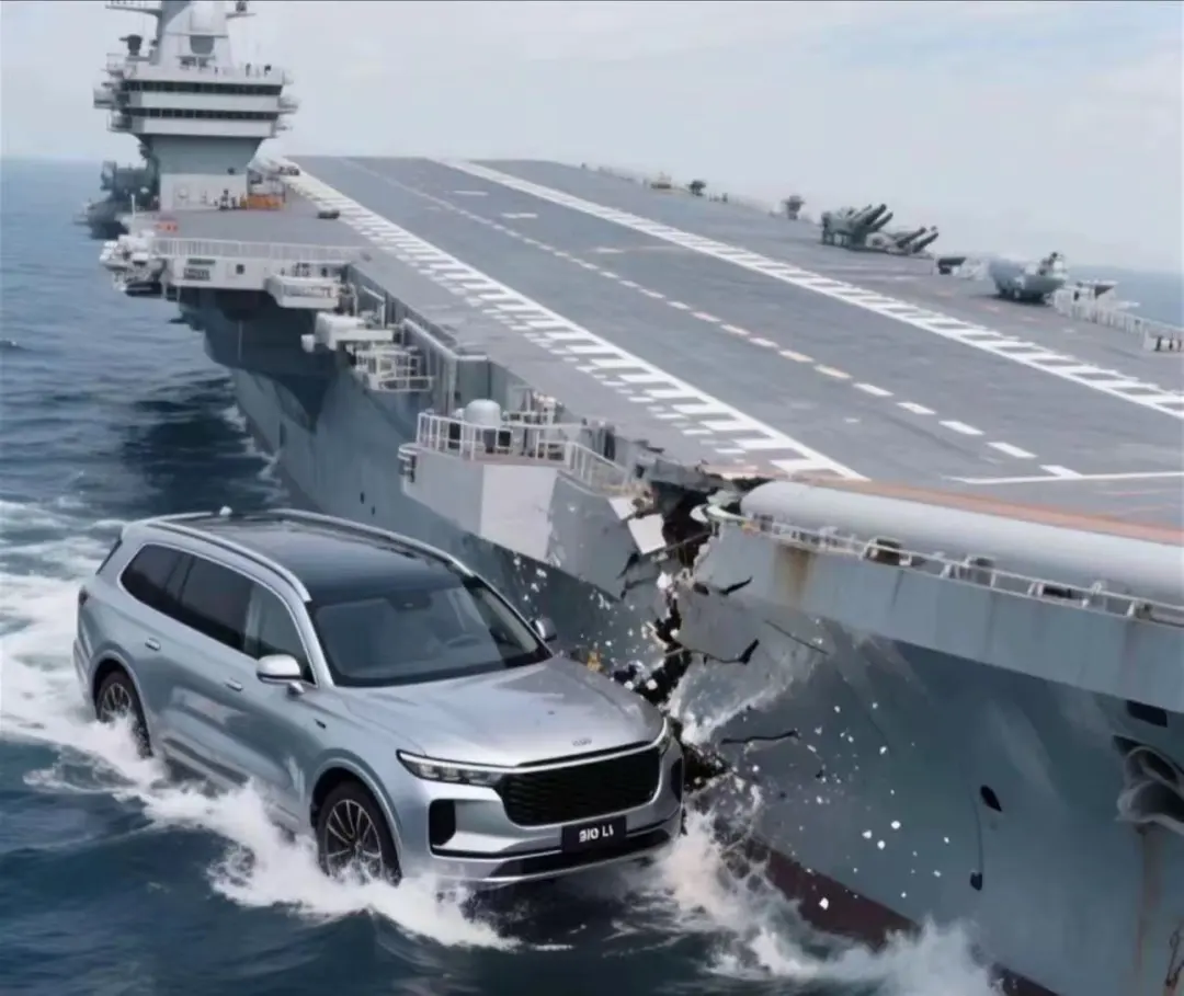 乐坏了的网友们,开始疯狂玩梗:用Ai生成理想i8创翻坦克、高铁甚至航母的梗图,更有网友建议两边老总开着各自的车再对撞一次,一绝高低。