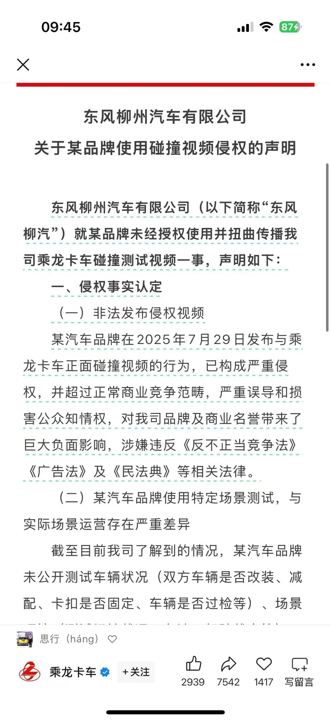 在声明中,东风柳州汽车有限公司认为,某汽车品牌发布的与乘龙卡车正面碰撞视频的行为,已构成严重侵权,严重误导和损害公众知情权,对品牌及商业名誉带来了巨大负面影响。