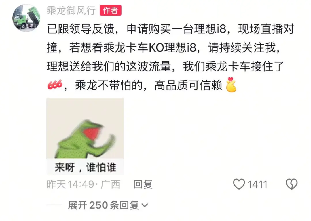 对此,抖音上疑似乘龙卡车的工作人员表示,已跟领导反馈,申请购买理想i8,现场直播对撞。