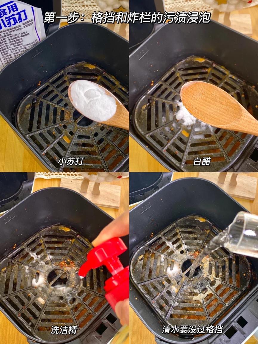 首先准备好小苏打,白醋和洗洁精,加清水没过空气炸锅的隔栏。
