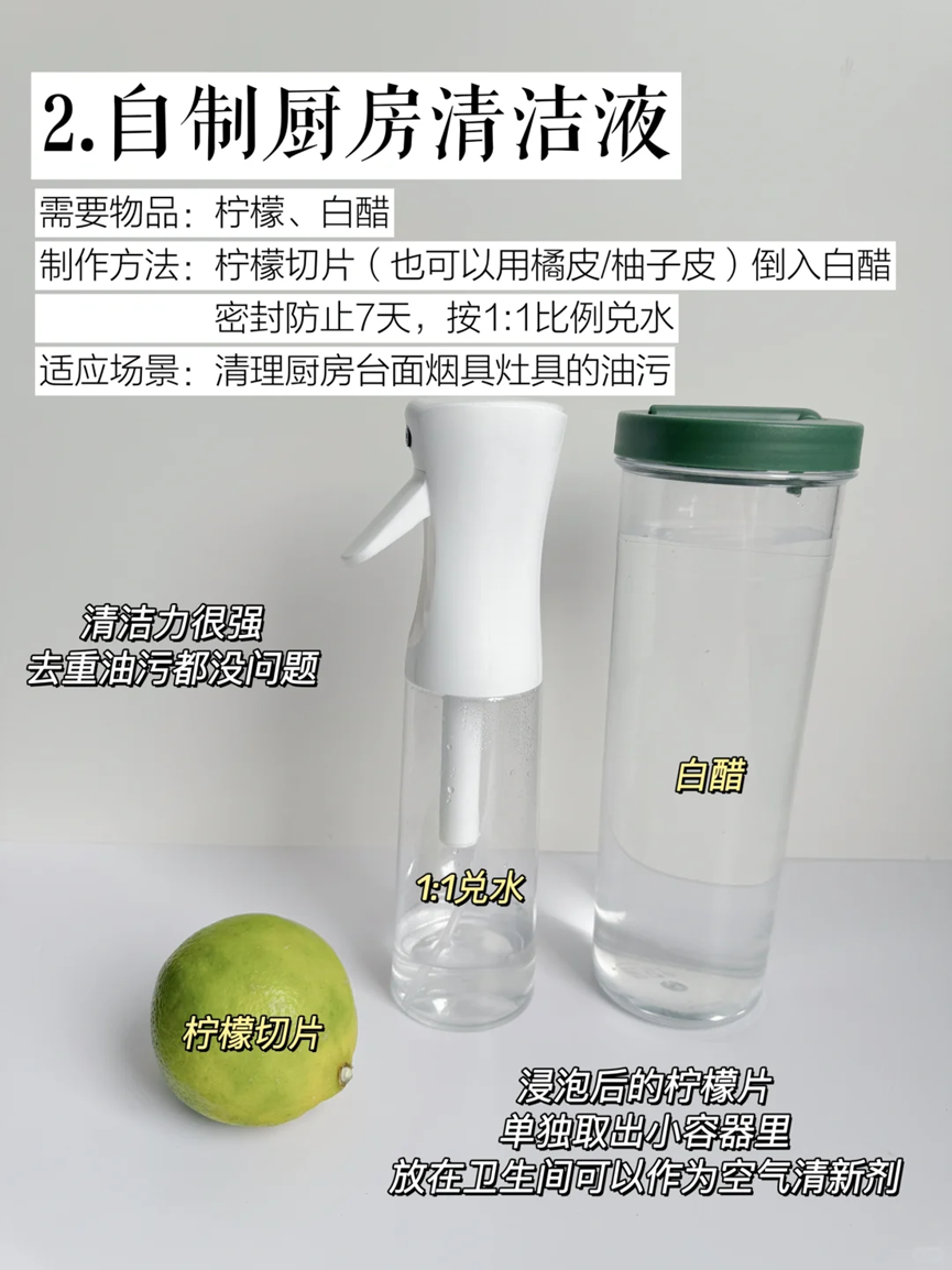 大家还可以自己使用柠檬加上白醋制作厨房清洁剂,可以用来清洁厨房台面以及油烟机和灶具表面的油污。