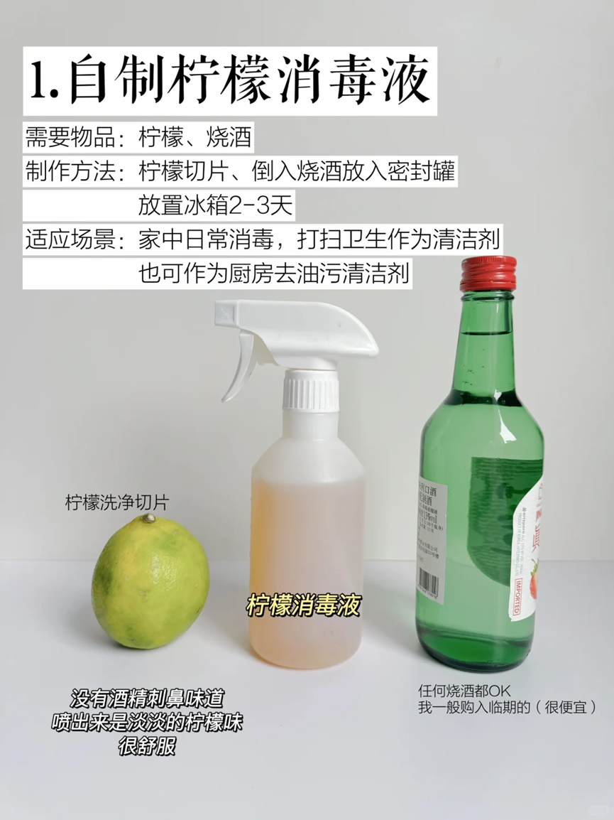 比如大家可以自己制作柠檬消毒液,只需要将柠檬切片倒入烧酒当中,放进一个密封的罐子里面,冷藏2~3天左右就可以了。