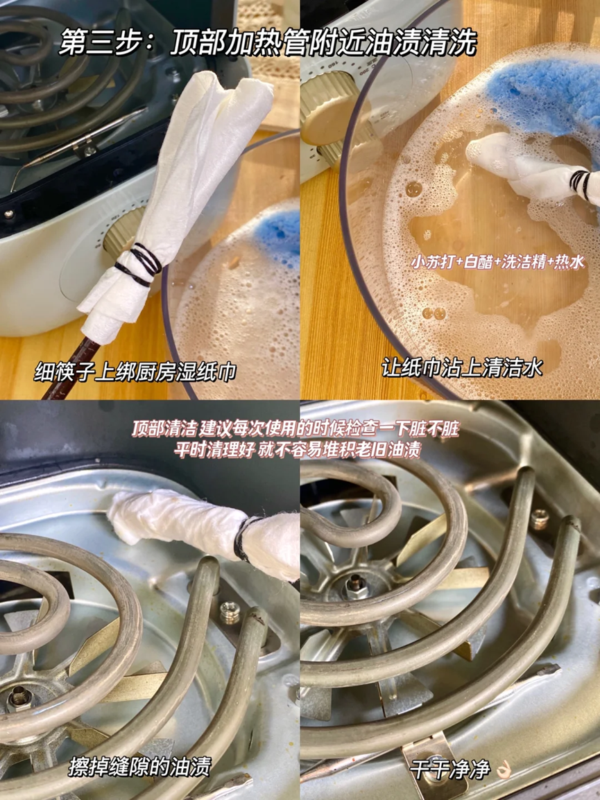 将空气炸锅顶部加热管附近的油渍清洗干净。