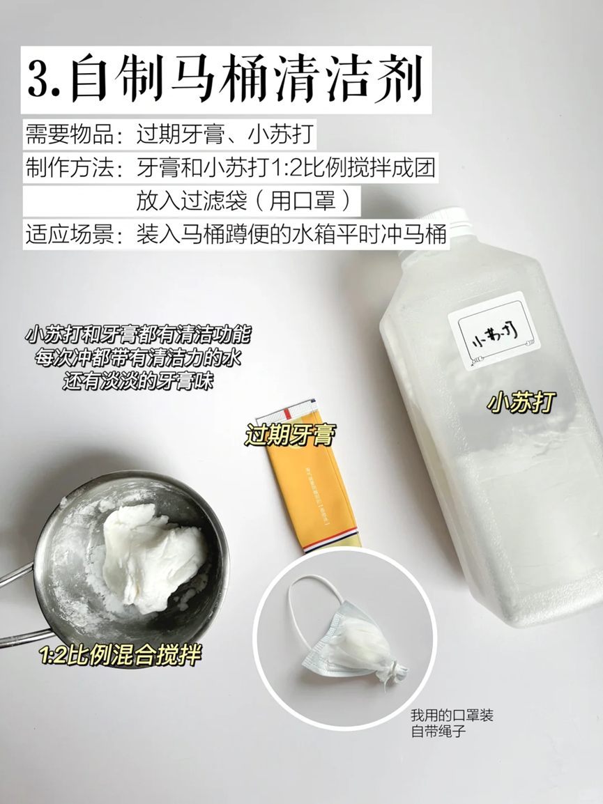 另外还可以使用过期的牙膏以及小苏打制作马桶清洁剂,只需要将牙膏和小苏打按照1:2的比例搅拌成团之后,