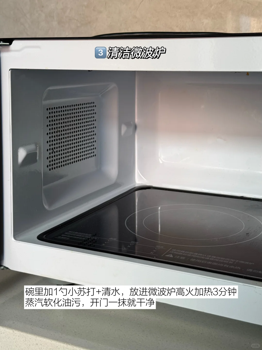加入一勺小苏打和适量的清水,放入微波炉里面高火加热三分钟,再用抹布一擦就可以了。
