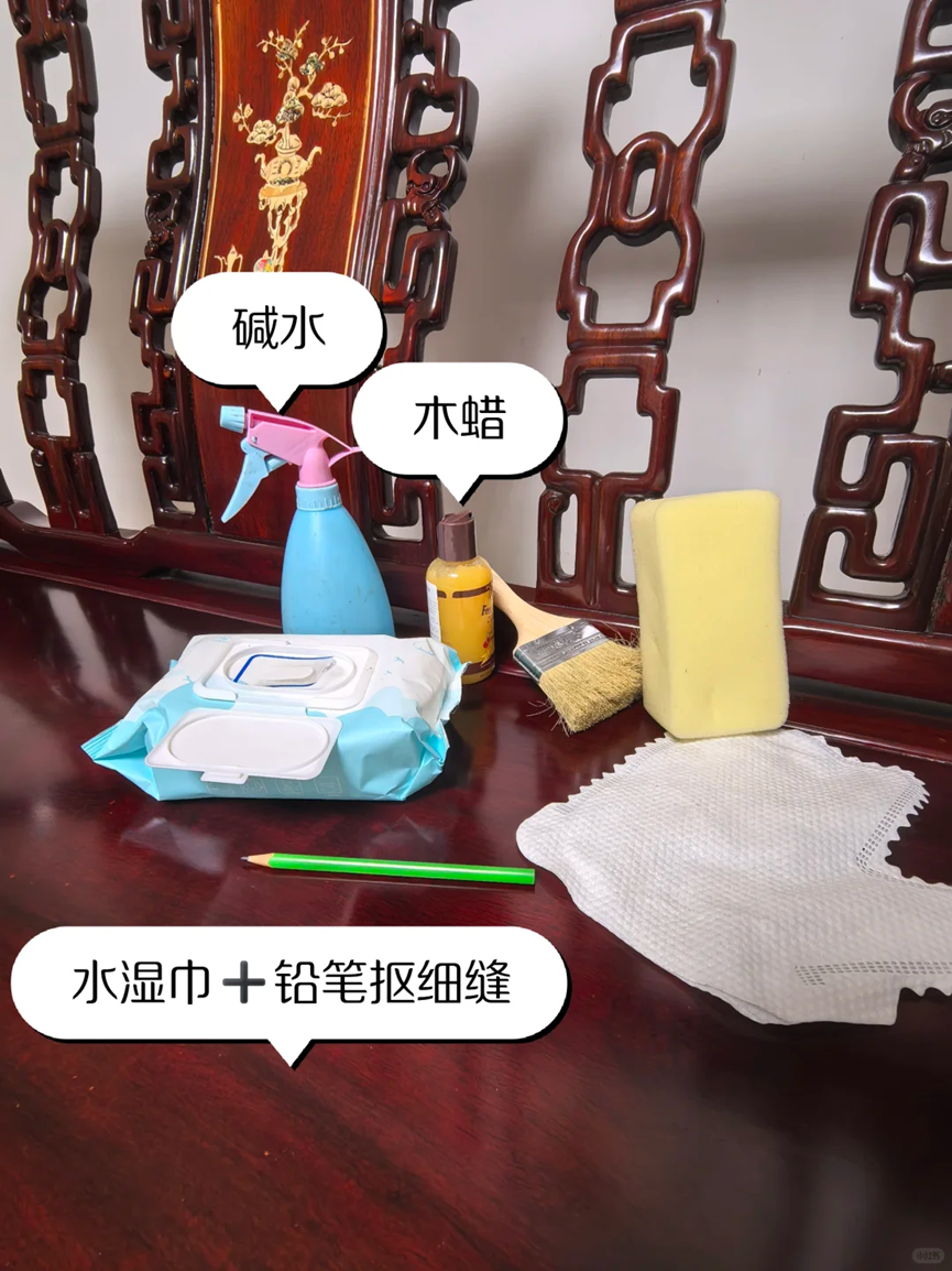 首先先用碱水加上刷子,去掉家具表面的一层浮灰,擦干之后再使用海绵打上木蜡油,清洁之后的家具非常的干净。