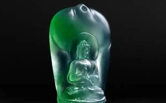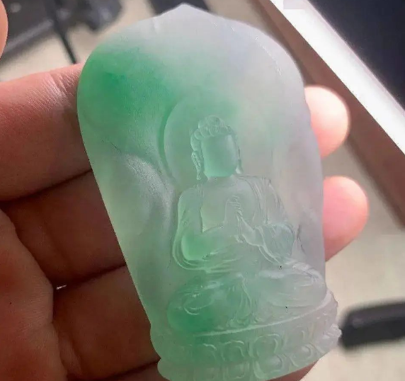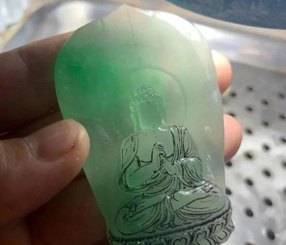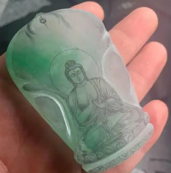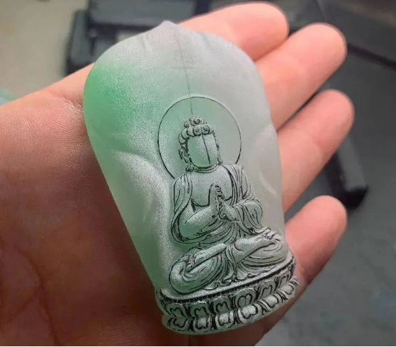 最后就只剩脸部雕刻了,等一切搞定后静待抛光即可。但从毛坯来看没抛光就已经非常漂亮,很起胶,跟果冻似的。玉雕师的功底很强,提水提得非常到位,把人物体现的很突出。