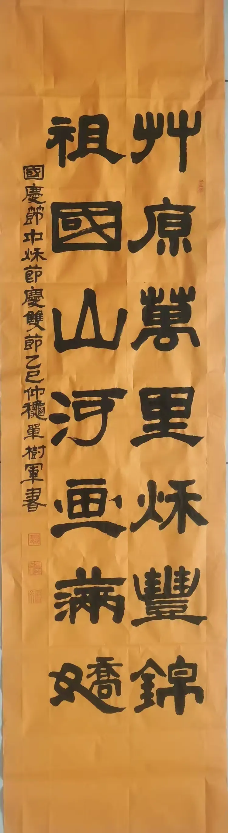 黄底黑字,“祖国山河画锦里,万年丰”端庄大气,隶书刚劲,如碑立大地。左侧小字清晰标注:“ 国庆节中秋节庆双节乙已仲秋单树军书 ” 。虽题于中秋,却在元旦之际焕发出新的意义——节日虽异,情怀相通。家国同庆,四时皆春。他的笔下,山河锦绣,五谷丰登,不只是对过去的礼赞,更是对新年的祈愿:愿山河无恙,人间皆安。