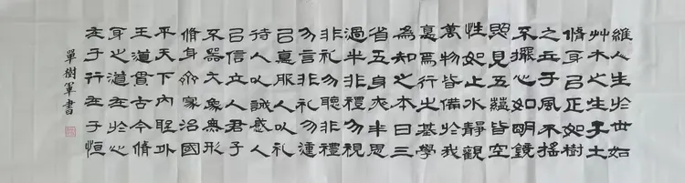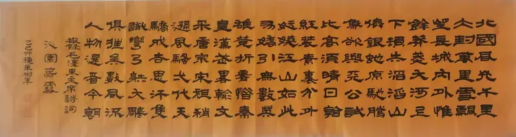 长卷徐徐展开,浅黄纸面如旧时信笺,楷书工整书写《沁园春·雪》。那是毛泽东主席的豪情诗篇,也是中华气魄的集中体现。单树军先生以楷书重现此作,一笔一画皆见敬畏,一字一句皆含深情。在这辞旧迎新的时刻,重温“数风流人物,还看今朝”,更觉热血澎湃。艺术不只是美的呈现,更是精神的传承。他的墨迹,让经典在新时代继续回响。