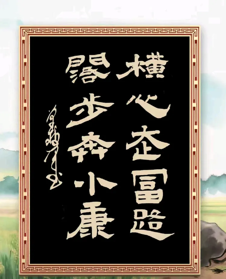 “横心走富路,阔步奔小康”,白字黑底,金边勾勒,远山含黛,田畴如画。这不仅仅是一句口号,更是千家万户在新春时节最真挚的心声。单树军先生将书法与山水意境相融,让文字不只是记录,而是成为一种生活的图景。那笔下的“阔步”,仿佛踏着春雷而来,带着泥土的芬芳与希望的绿意。在这辞旧迎新之际,他的墨迹成了时代的注脚,记录着一个民族稳步前行的步伐。