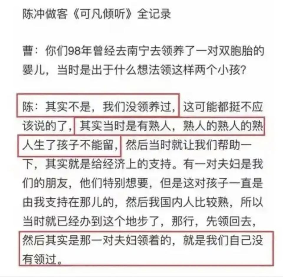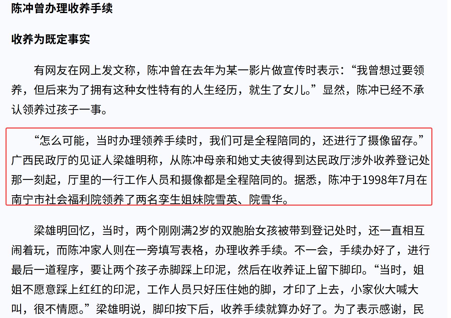 更离谱的是陈冲的态度,干脆不承认领养过双胞胎,只是“帮想领养孩子的熟人一个忙”。