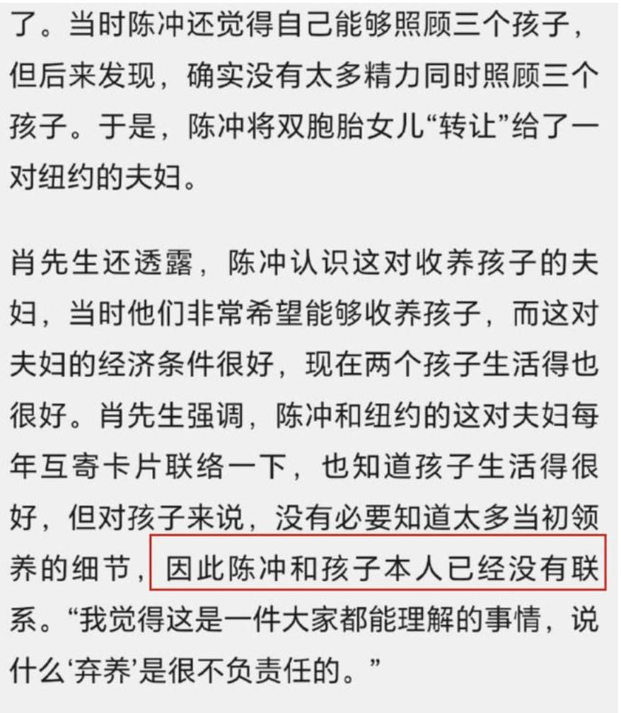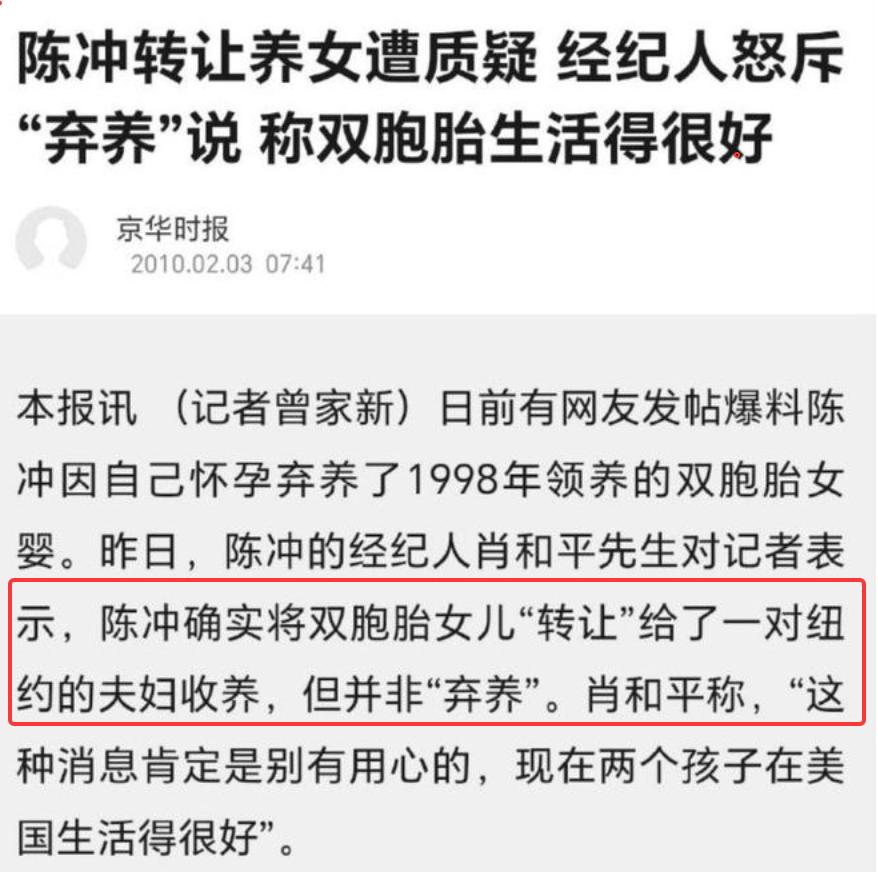 然而说是这么说,做就不是这么做了。在生完一胎女儿不久陈冲夫妇就以精力有限照顾不了三个孩子为由,将双胞胎姐妹“转让”给纽约一对经济富有的夫妻,并且强调不是弃养而是“转让”。