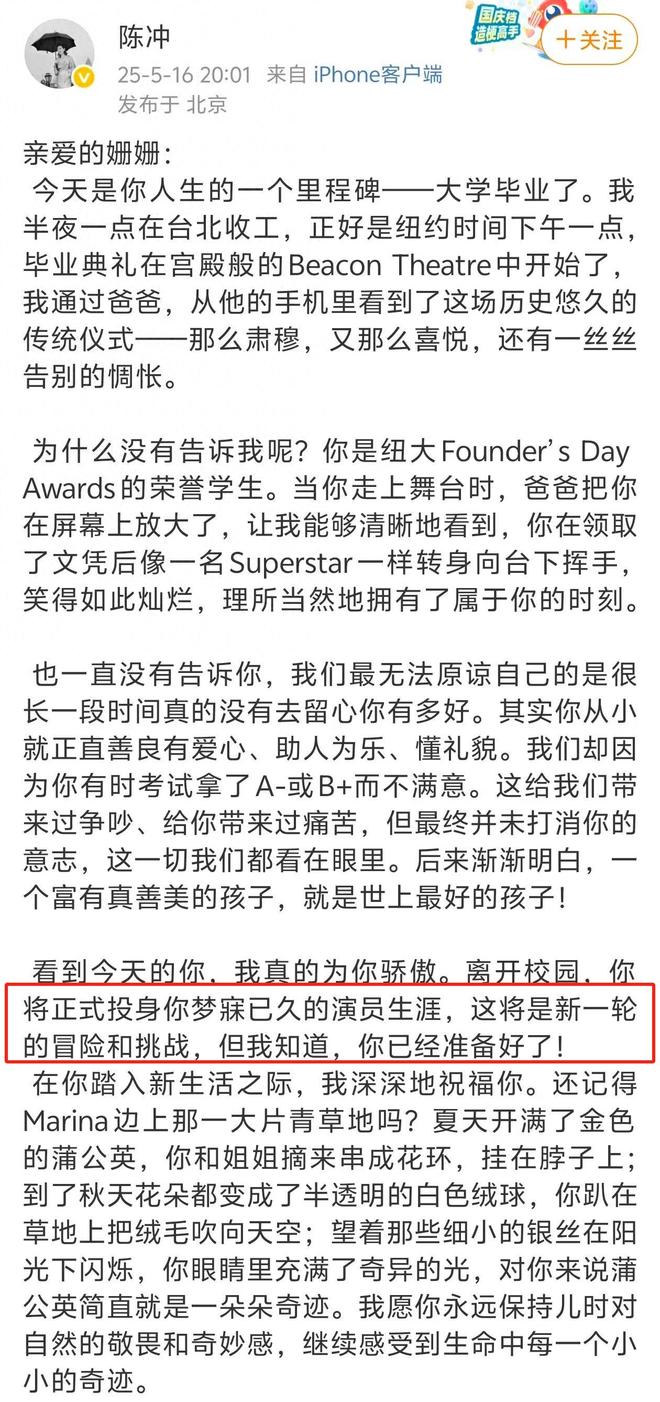 2025年陈冲出了一本自传《猫鱼》,书中自揭伤疤提到了在美国遭遇性侵的事情,也澄清了在春晚舞台说的“你们中国人”言论争议,还分享了两个亲生女儿成长的点滴,从她写给大女儿的信件看,母爱都要溢出来了。
