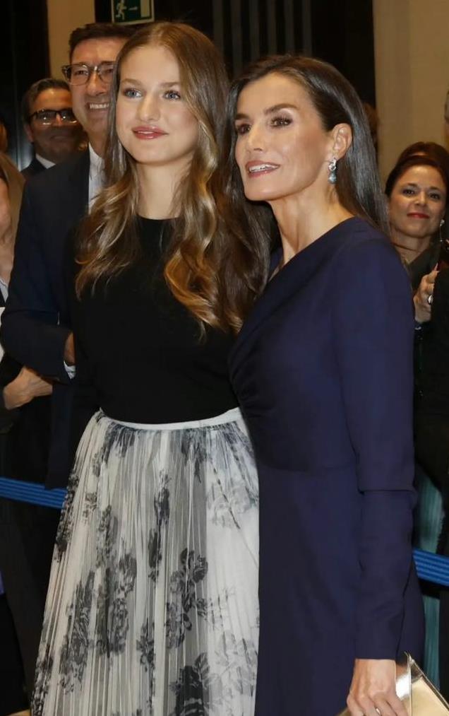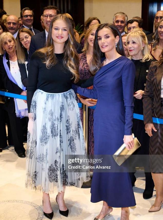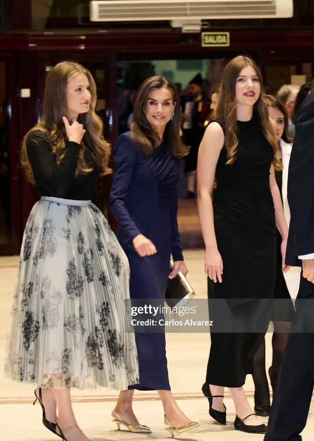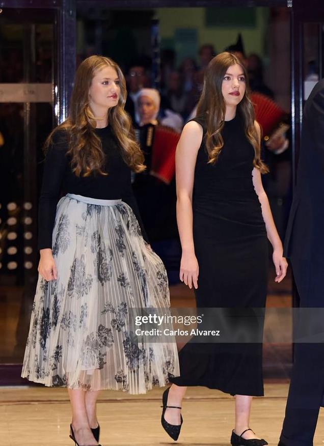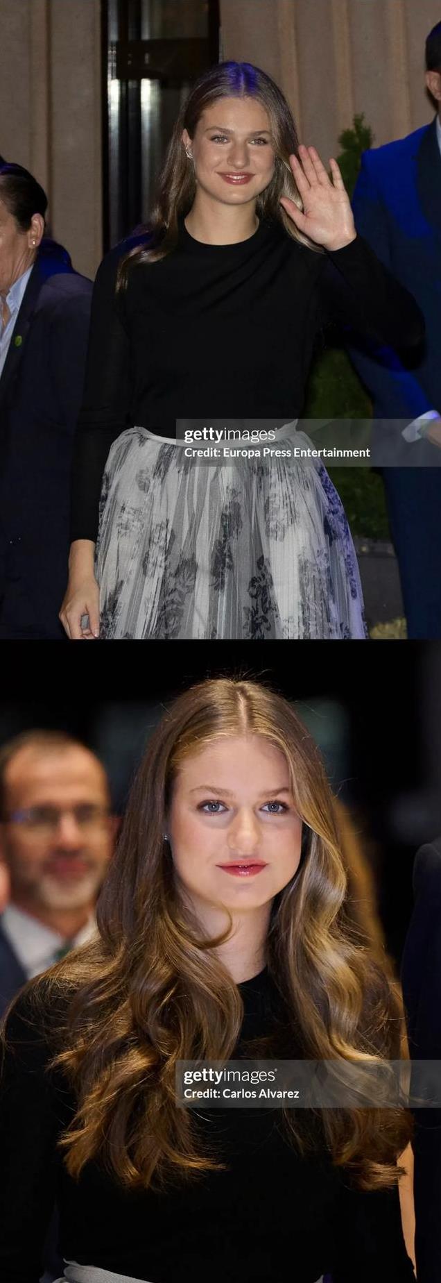 今天重点看看两位公主的造型,莱昂诺尔公主身穿黑色上衣搭配蓬蓬裙,踩着黑色高跟鞋,头发微卷非常漂亮。