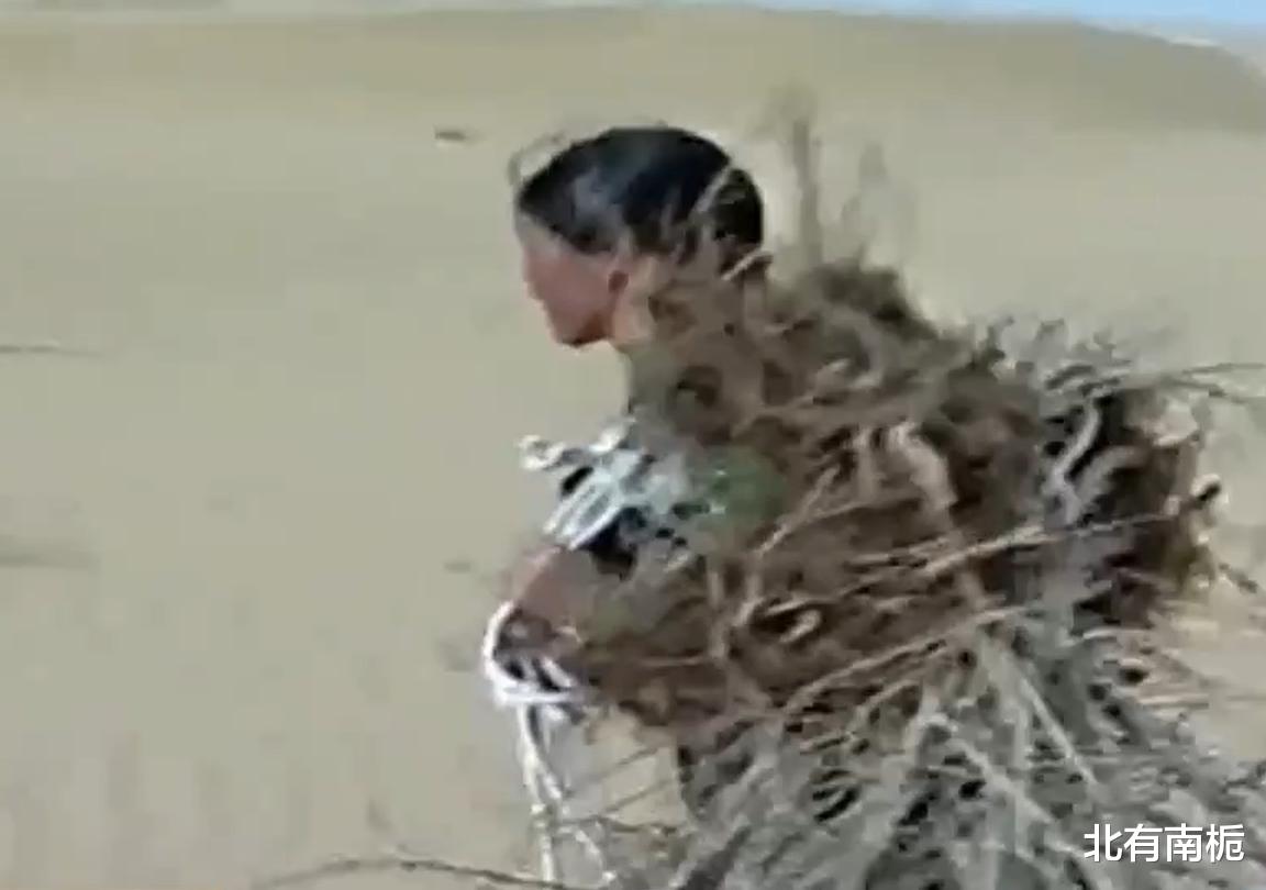 在一次去种树的时候,殷玉珍不慎从沙中跌倒,但她毅然决然地背着树苗前进。