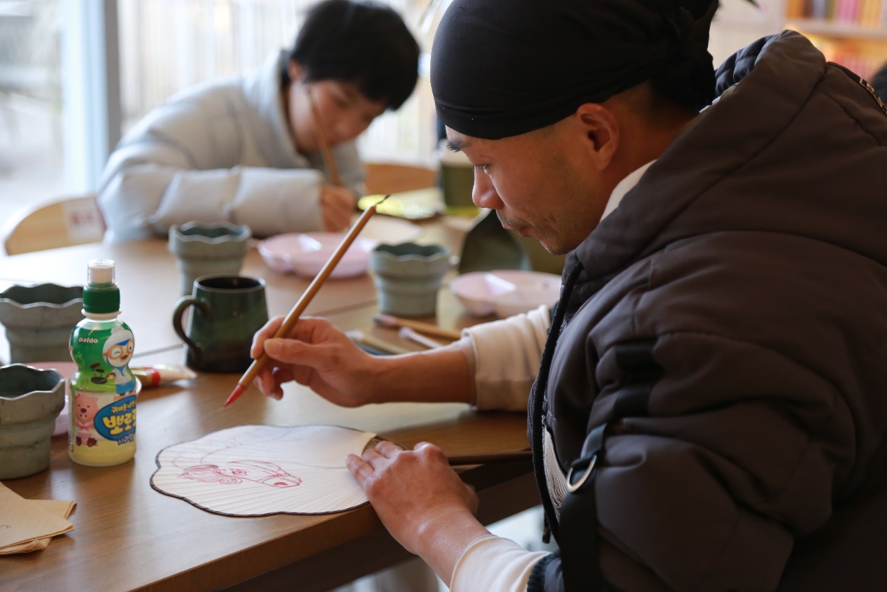 1月2日的“画团扇”体验活动中,吴门扇艺书画老师、吴中区美术家协会会员苏健伟老师亲自执教。苏老师作为本次助残项目的授课老师,深谙残障学员的学习特点,也格外擅长用通俗易懂的方式传授技艺。活动现场,他耐心指导参与者勾勒线条、调配色彩,从构图设计到笔墨运用,每一个细节都讲解得细致入微。参与者们凝神专注,在洁白的扇面上描绘出心中的美好图景,有的复刻传统纹样,有的创作新年主题画作,一把把素净的团扇在笔墨点缀下变得鲜活灵动。不少参与者表示,亲手画扇的过程不仅是一次技艺体验,更能让人在专注中舒缓心情,深刻体会到非遗创作的治愈力量。