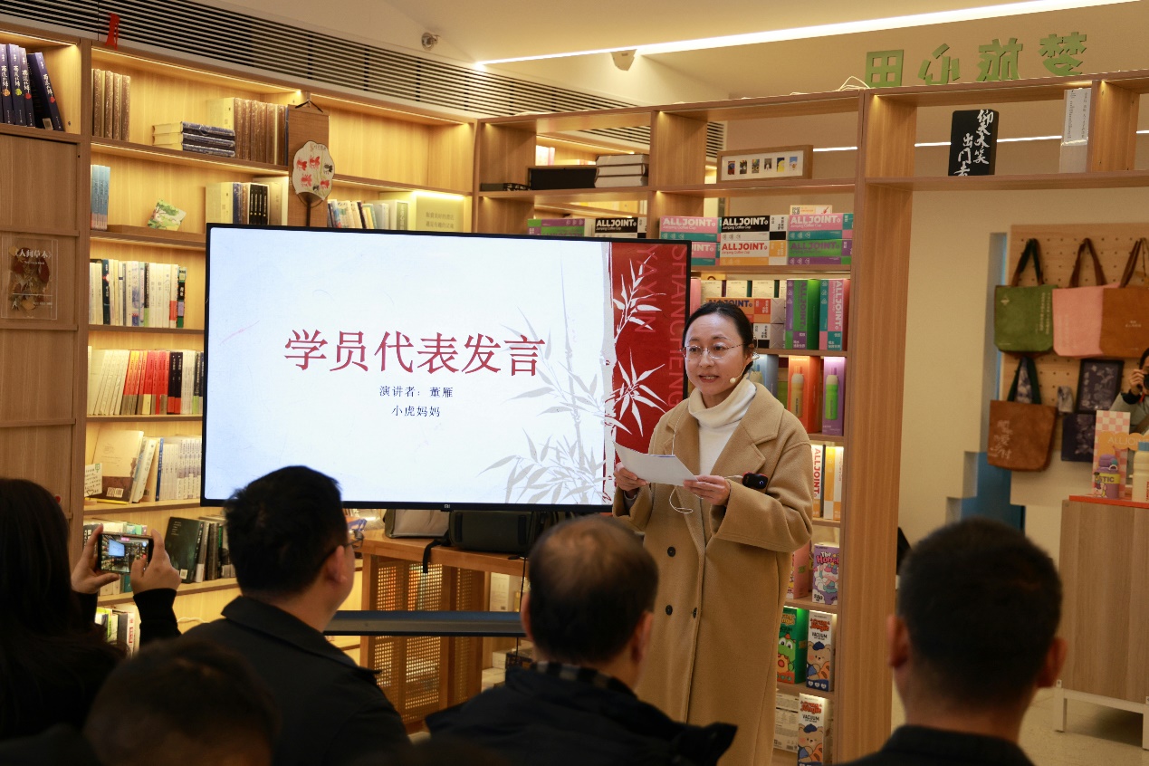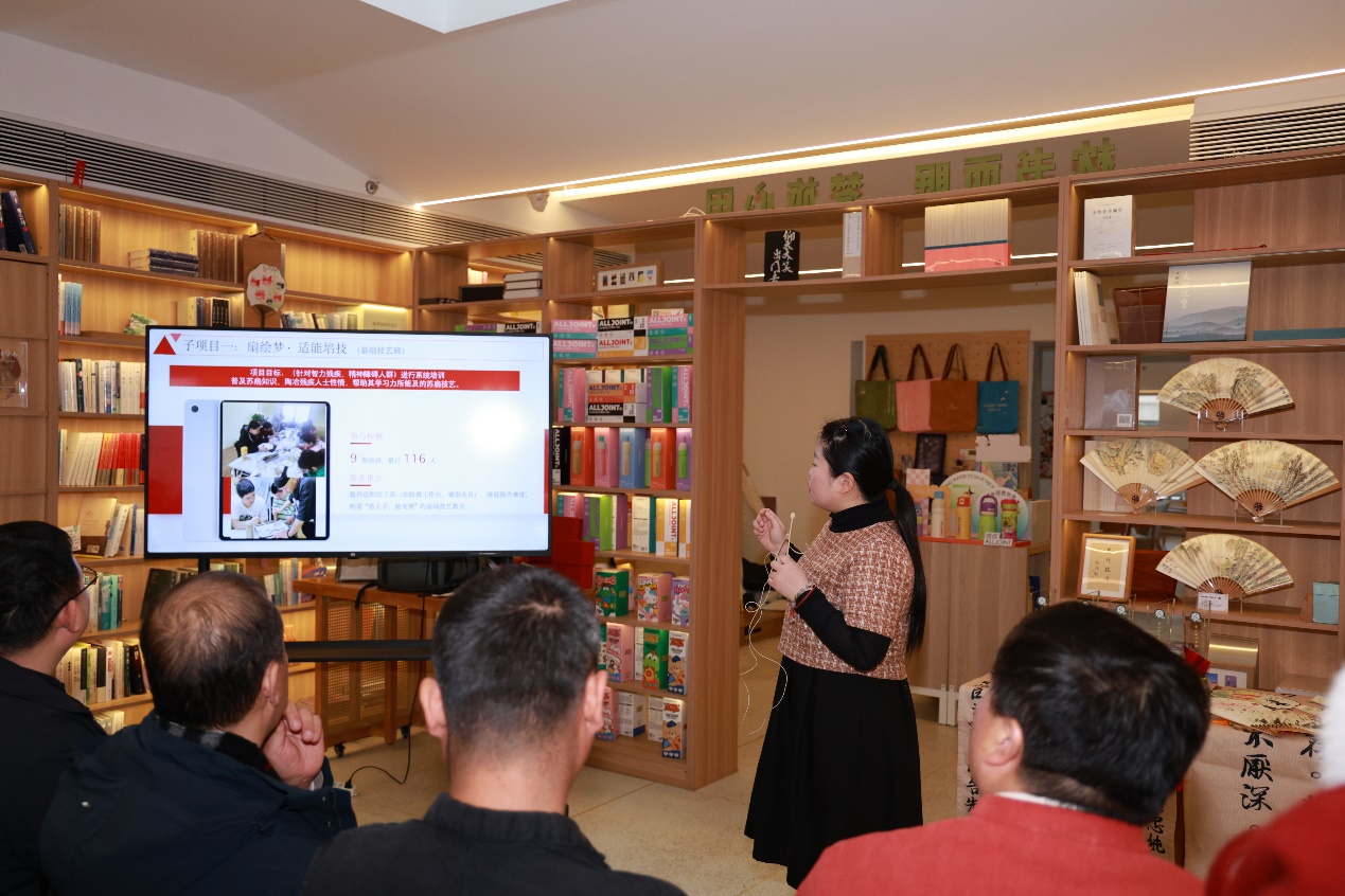 随后,项目负责人潘静芝女士详细介绍了2025助残项目的亮眼成果。过去一年,在各方助力下,项目以苏扇技艺传承为抓手,帮助众多残障学员找到自信与方向,一幅幅精美的师生共创扇作,便是学员们努力与热爱的最佳见证。学员代表小虎妈妈的发言更是真挚动人,朴实的话语里满含对项目的感激与对未来的期许,让现场众人深切感受到苏扇技艺为残障群体带来的改变与新生。