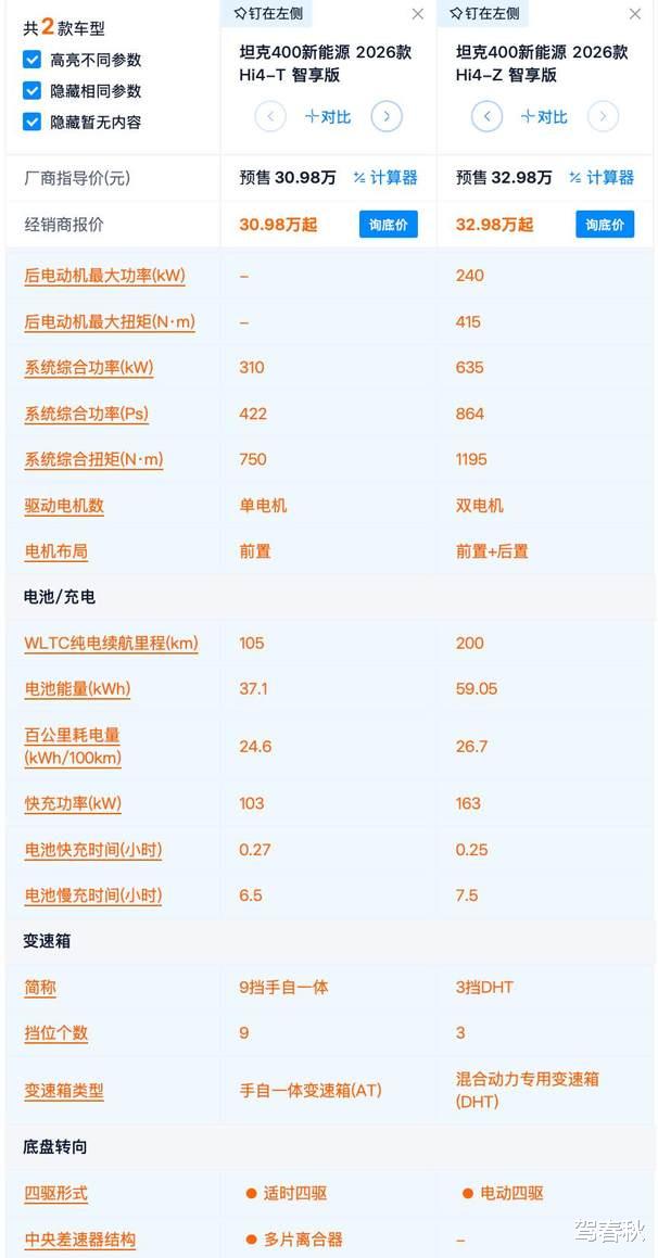先来说两台车最明显的差别,其实就是在动力上。虽然都采用了长城最新的Hi4技术,但是Hi4-T和Hi4-Z还是有明显差别的。
