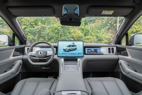 腾势N8L DM的内饰采用的是环抱式的设计布局,铂檀灰的内饰配色显得十分素雅,车厢内采用了大面积的皮质包覆,使其手能够触摸到的地方十分细腻,中控台上采用了三块屏幕的布局方式,分别是左右两侧内嵌的13.2英寸屏幕以及中间17.3英寸的液晶大屏,分辨率均为2.5K,搭载的是DiLink车载智能系统,支持手机App远程控制、高德地图导航、蓝牙/车载电话、Carlink、HUAWEI HiCar、车联网、OTA升级、面部识别、语音识别控制系统、多指飞屏操控、Wi-Fi热点以及应用商店拓展等功能,智能化表现非常丰富,能够给日常驾驶带来足够高的便利性。两幅式的多功能方向盘造型时尚美观,支持四向电动调节,并带有记忆和加热功能,换挡形式为电子式怀挡,手机无线充电功能也并未缺席,另外,车内还配备了20个帝瓦雷品牌的扬声器,支持天空声道、杜比全景声以及K歌功能,对于喜欢听音乐的朋友们来讲算是一个福音。