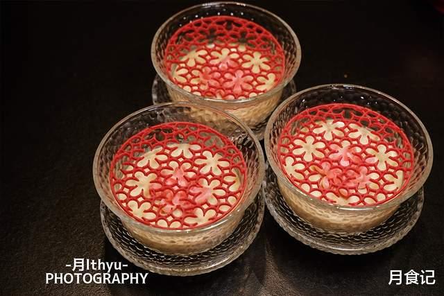 最后的甜品是——武夷岩茶烤奶,上桌就被它的颜值惊艳到!甜品分为三层,最上层像窗花的饼干;第二层是一朵盛开的莲花;最下面的是烤奶!茶香混着奶香,入口就让人回味,确实堪称用心。