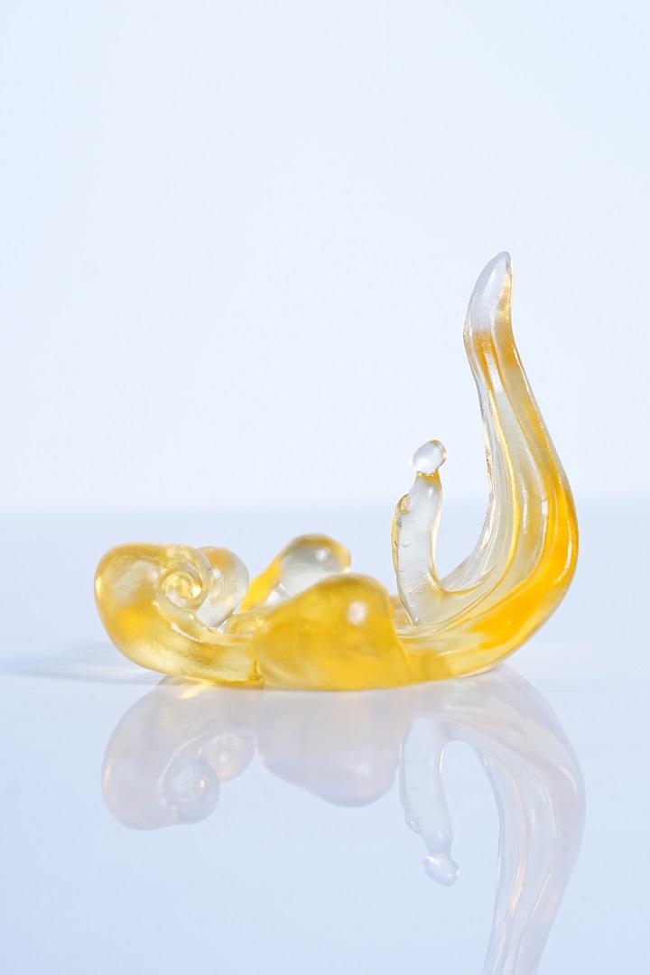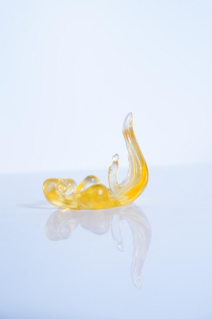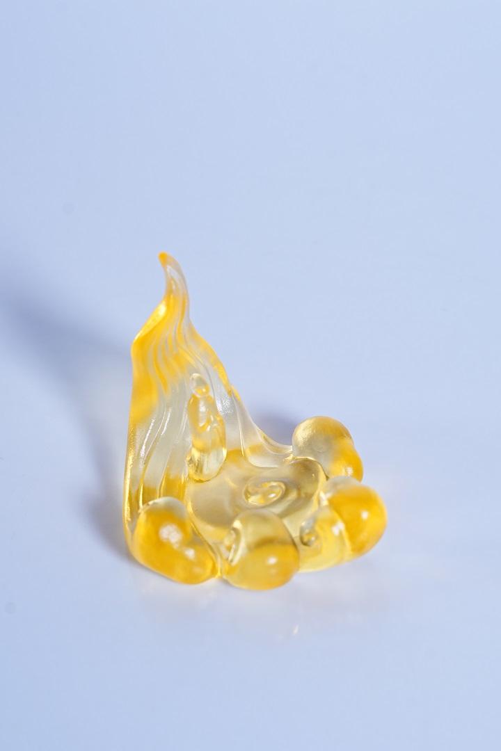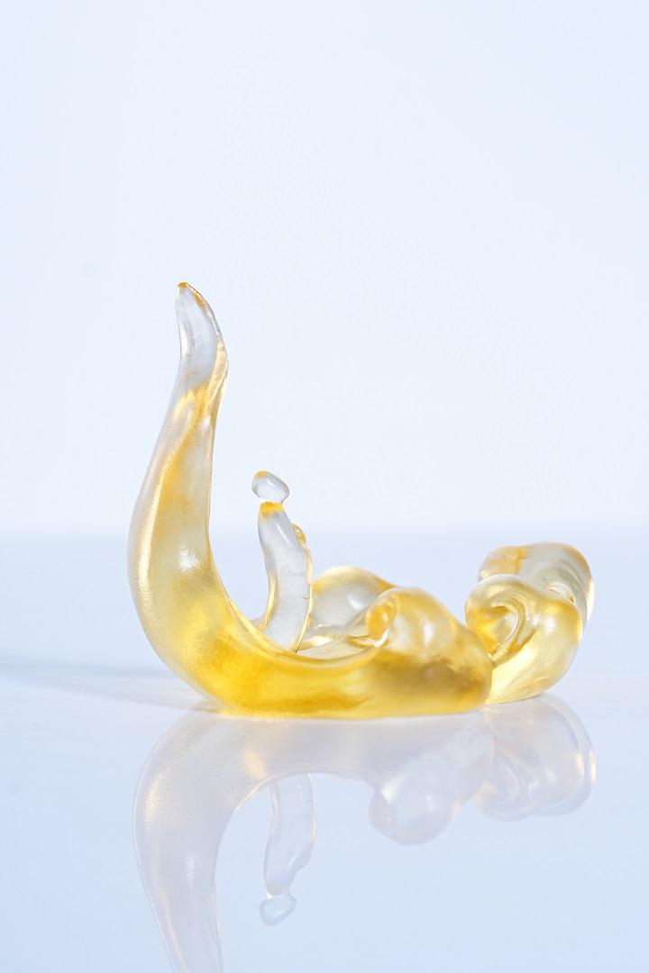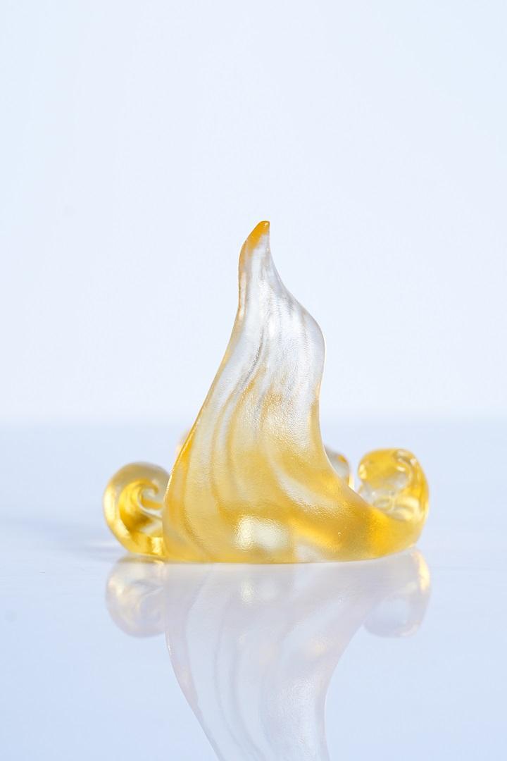 其中,脱蜡铸造技艺堪称古法琉璃制作的核心与精髓。当含蜡石膏模制成后,以蒸汽加温脱蜡,蜡质在高温中逐渐消融,只留下精细的耐火石膏阴模 。随后,将配置好的琉璃原料填入阴模,放入炉内,再度经历高温烧制的洗礼,在 1000℃左右的高温中,琉璃原料慢慢熔化、融合、流淌,填充进模具的每一处缝隙,精准地复刻出云水的造型。待冷却拆模后,粗胚初现,然而这还不是终点,后续还有漫长的细修、研磨、抛光工序,反复打磨,直至琉璃表面光滑如镜,光泽温润如玉,将琉璃的晶莹剔透与云水的飘逸灵动完美呈现。
