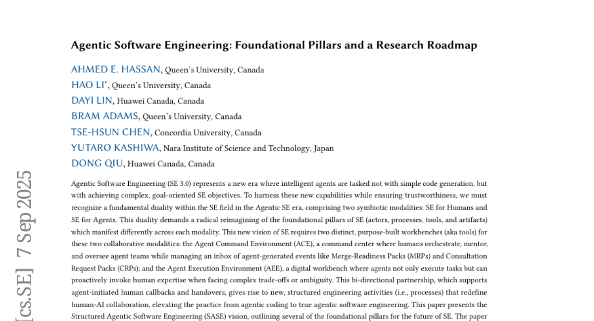 这项由加拿大Queen's大学的Ahmed E. Hassan教授领导的研究团队发表于2025年9月的论文,全面探讨了软件工程领域正在经历的一场前所未有的变革。该研究论文题为《Agentic Software Engineering: Foundational Pillars and a Research Roadmap》,有兴趣深入了解的读者可以通过arXiv:2509.06216v1访问完整论文。研究团队包来自Queen's大学、华为加拿大公司、康考迪亚大学以及日本奈良科学技术大学院的多位知名学者。