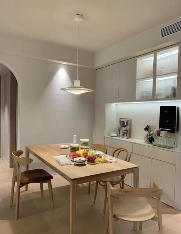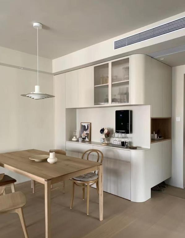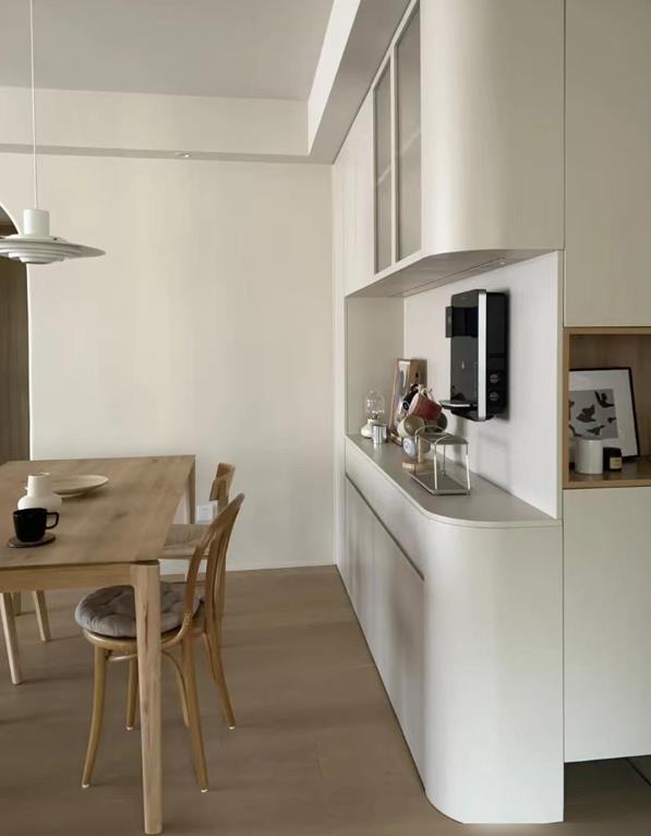 餐厅区域的设计展现出了一种独特的审美观, 通过选用弧形桌面的设计,增强了空间的通透感,同时, 下沉式的餐厅上方采用了玻璃门的上柜,进一步提升了空间的通透性,这样的设计既实用又美观,让餐厅空间更加轻盈和明亮。