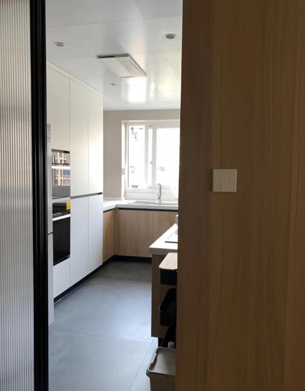 厨房的设计极具巧思,采用了实木饰面板的装饰,融合了多种现代家居设计理念, 展现出了极高的美观性。特别是厨房门的隐藏设计,确保了整体造型的完整性,避免了现代家居中常见的门板突兀感,这样的设计,既实用又美观,让厨房空间更加和谐统一。
