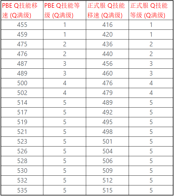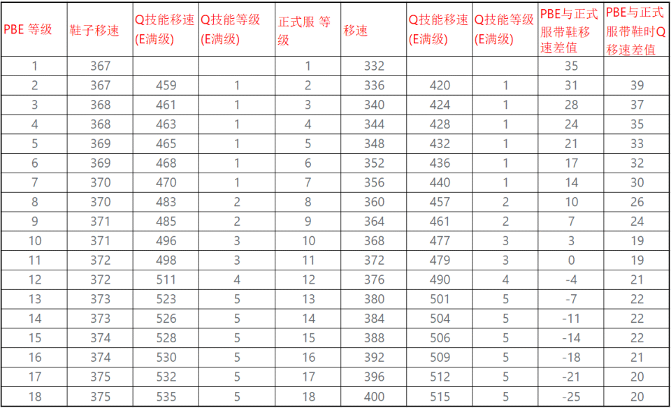 出于好奇,我只想纯粹从移动速度的角度来分析,这里提供一份整理后的数据图。如果我只有一级鞋,那么到了多少级我的移动速度会显得不足?因此,所有这些数据都是在仅有一级鞋的情况下测算的。感兴趣的玩家可以仔细研究一下数据。表格1是E技能满级时,卡西奥佩娅在PBE与正式服的移速对比(穿着鞋子)。表格2是Q技能满级时,卡西奥佩娅在PBE与正式服的Q技能移速对比。