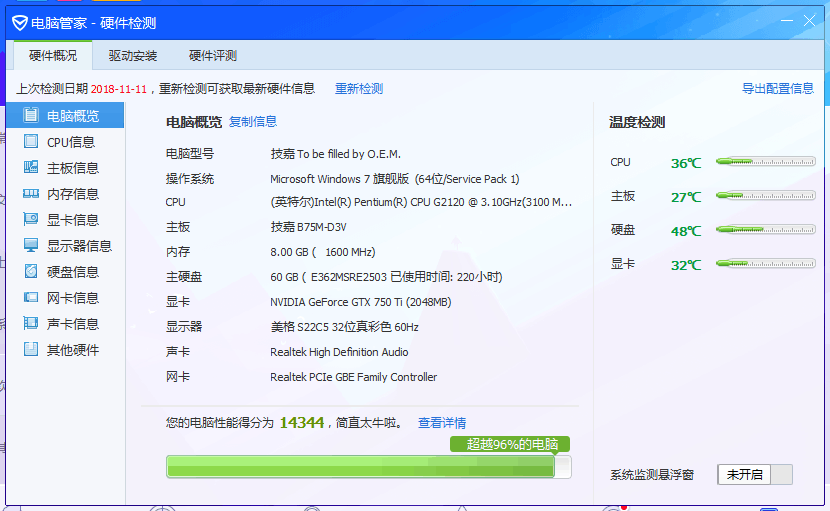 废话不说,直接看电脑四大件,CPU 奔腾G2120 内存8G DDR3-1600 显卡GTX750Ti,60G固态+500G机械。