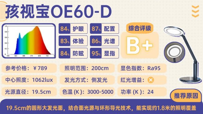 孩视宝OE60-D采用简约的黑色设计,能融入多种家居风格。其核心特点是约19.5cm的圆形大发光面,结合面光源与环形导光技术,能实现约1.8米的超广照明覆盖,非常适合大书桌或双人学习场景。它支持触控操作和3000K-5000K色温调节,适配性较好。但作为侧发光产品,其光线的实际柔和度表现中规中矩,在较近距离下可能仍有轻微刺眼感;触控面板在潮湿环境下的灵敏度偶尔不稳定,且蓝光抑制表现属于主流水平,长时间使用的舒适度有提升空间。