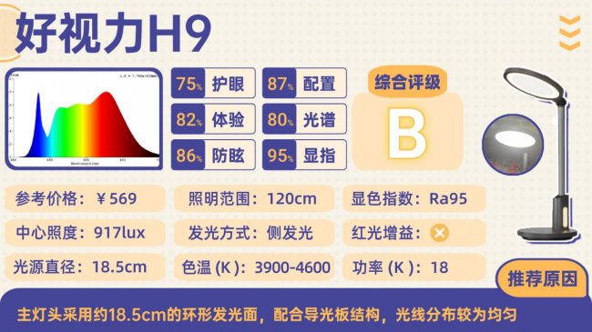 H9的设计简洁实用,采用ABS塑料材质,重量较轻。一个贴心设计是灯柱上集成了独立的小夜灯,轻触即可开启,方便夜间临时照明。主灯头采用约18.5cm的环形发光面,配合导光板结构,光线分布较为均匀,能满足约1米桌面的基础读写照明。显色指数为Ra95,达到合格标准。不过,受限于成本,整体材质和手感较为普通,灯头转轴调节的阻尼感和稳定性一般。它是一款功能明确、价格实惠的入门级护眼台灯。