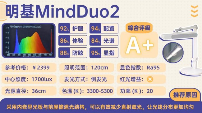 明翼采用独特的T型光源与43cm弧面灯头设计,能提供约1.4米的宽广照明范围,中心亮度充足,适合桌面空间较大的使用场景。功能配置较为全面,支持色温无极调节,并配备了入座感应、定时休息、夜灯模式等实用功能,自动化程度较高。不过,其在护眼技术的深度上有所取舍:蓝光峰值控制处于行业常规水平,且未引入光谱优化技术,长时间高负荷用眼下的舒适度可能受影响。此外,所有控制按键均位于灯头,调节时需起身操作,便利性不足。
