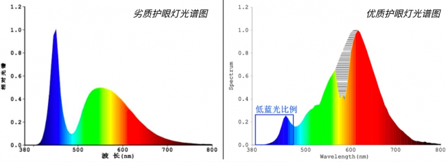 (2)全光谱的技术价值体现在哪里?蓝光更温和:通过优化芯片配方或增加荧光粉种类,全光谱技术可以将415-455nm有害蓝光的峰值压低,使其分布更平缓,减少对视网膜的潜在刺激。