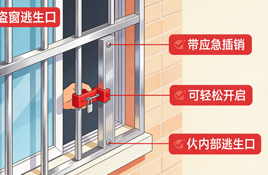 防盗窗应预留逃生口:安装防盗窗时,务必预留可随时开启的逃生口,并确保能从内部轻松打开,避免火灾发生时成为 “牢笼”。